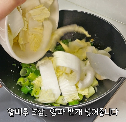 알배추 5장 , 차돌 한 줌 , 숙주 한 줌 , 양파 1/2개 , 대파 1대 , 청양고추 1개 , 사골육수 2팩 , 간장 2스푼 , 고춧가루 2스푼 , 굴소스 1스푼 , 후추 약간 , 다진마늘 1스푼 , 물 국그릇 기준 2번(약 600ml)