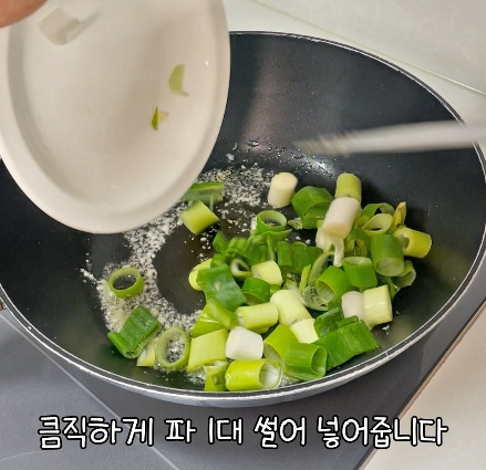 마늘 향이 올라오면 대파 한 대를 큼직하게 썰어 넣고 함께 볶아 향을 더해주세요.