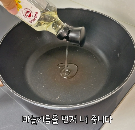 팬에 식용유를 두르고 다진 마늘 1스푼을 넣어 약불에서 천천히 볶습니다.