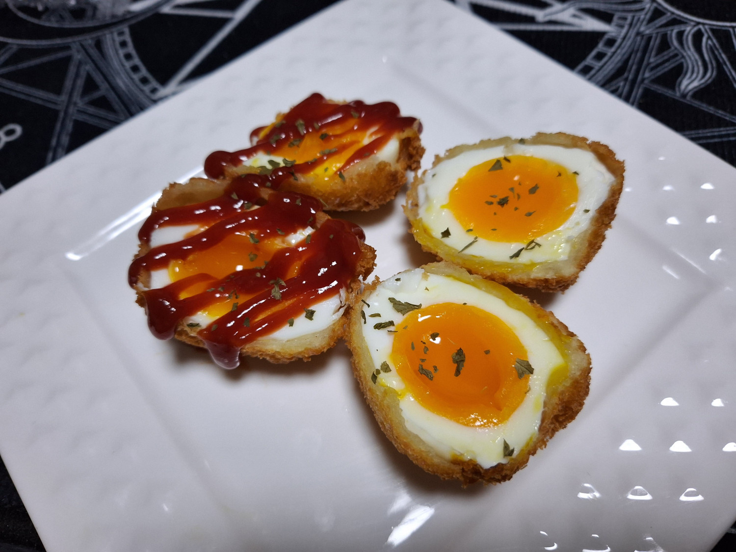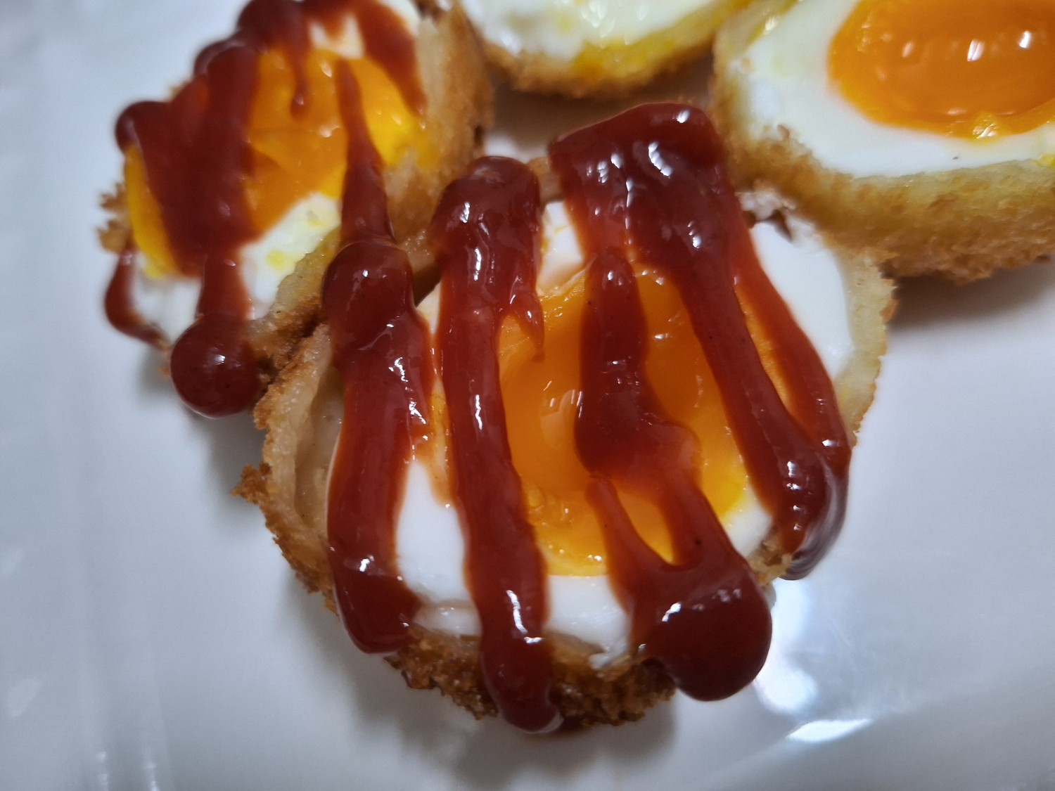 썰어준 반숙달걀튀김 위에 케첩을 뿌려줍니다.
