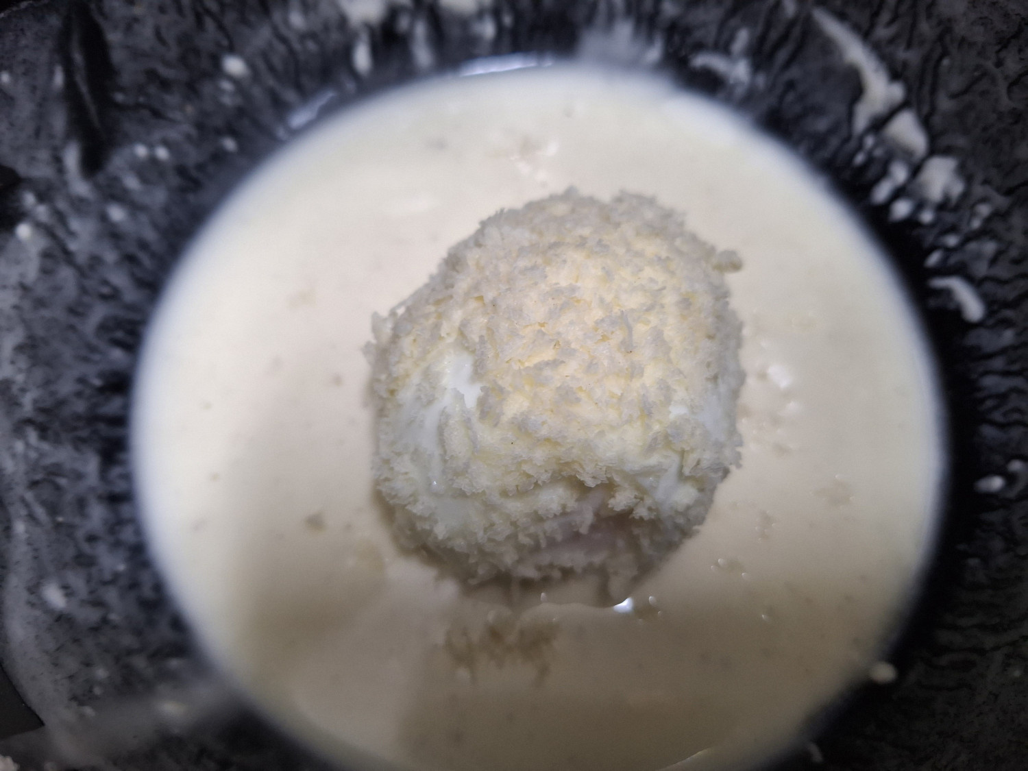 삶은 달걀을 튀김반죽에 먼저 넣어 골고루 묻혀주세요.