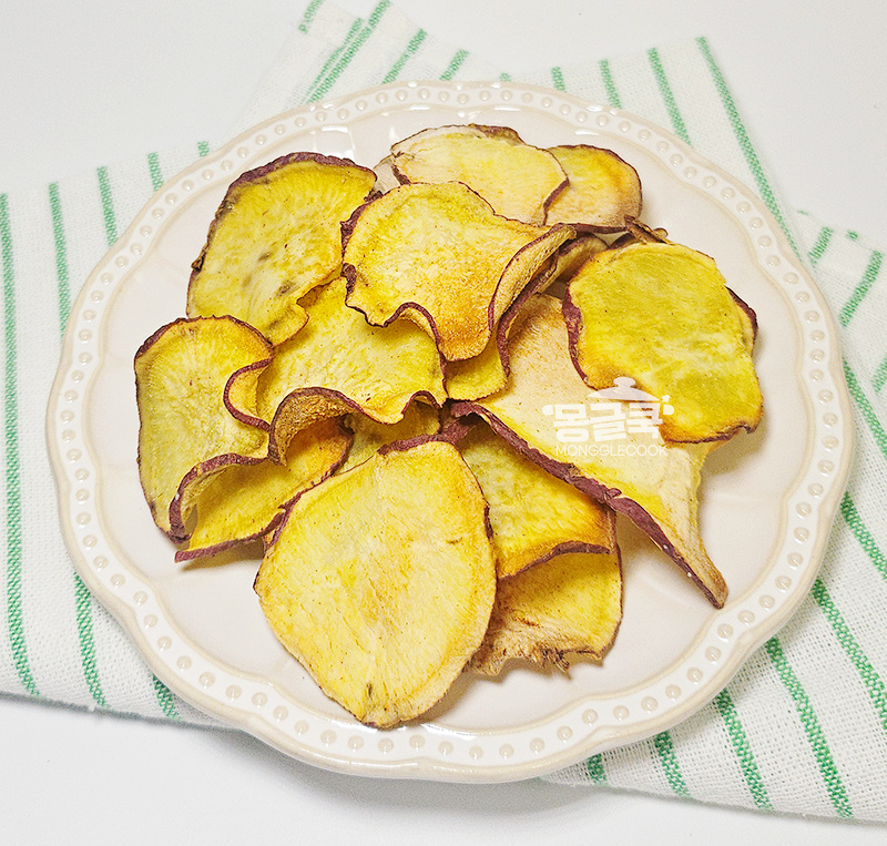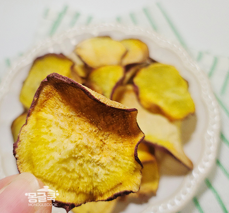 일정한 두께로 썰어야 칩이 고르게 익고, 바삭함도 훨씬 좋아요.