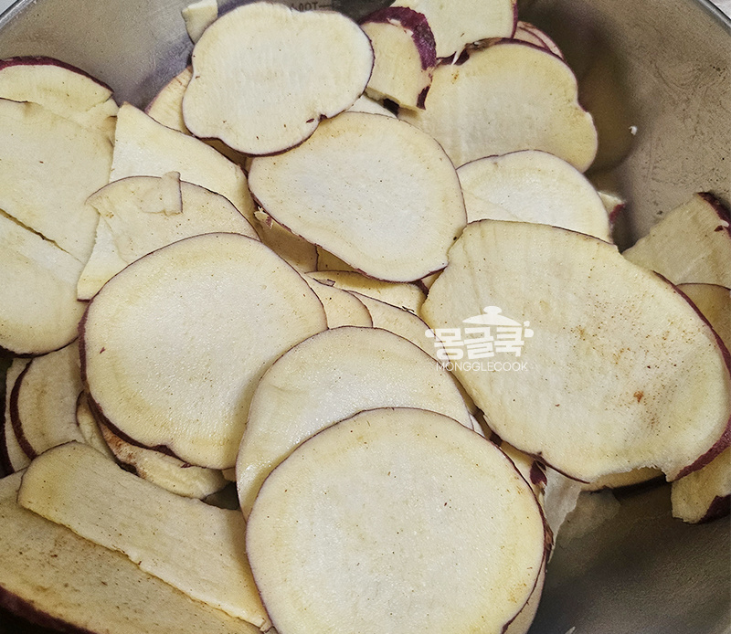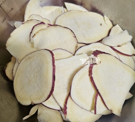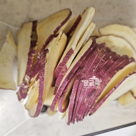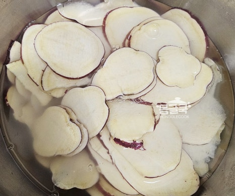 슬라이스한 고구마는 바로 찬물에 담가주세요.