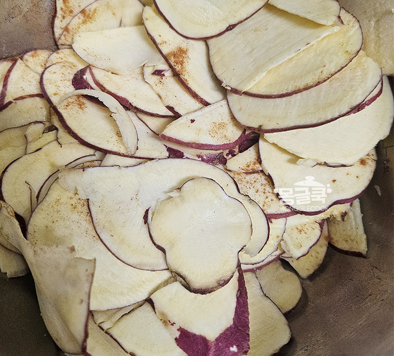 여기에 소금, 설탕, 계핏가루 등을 조금 넣으면 더 풍미 있는 고구마칩이 완성돼요.