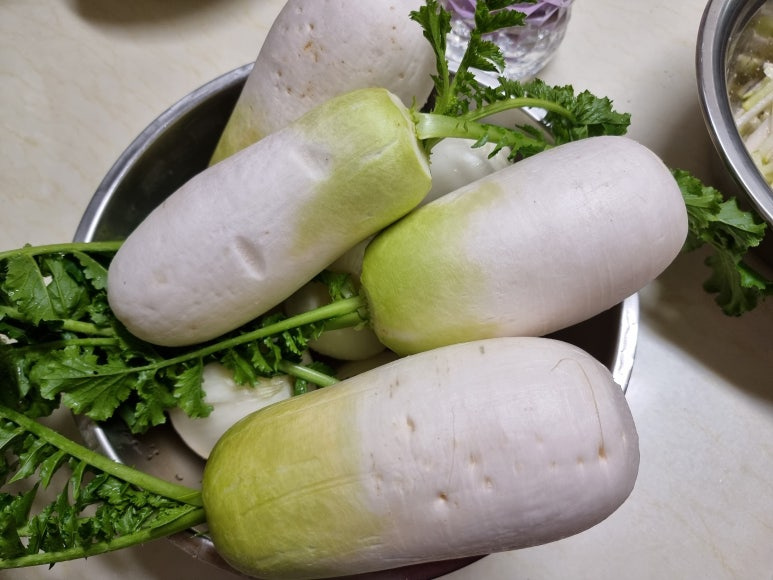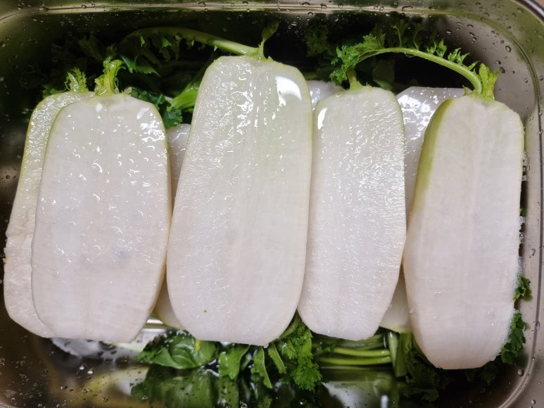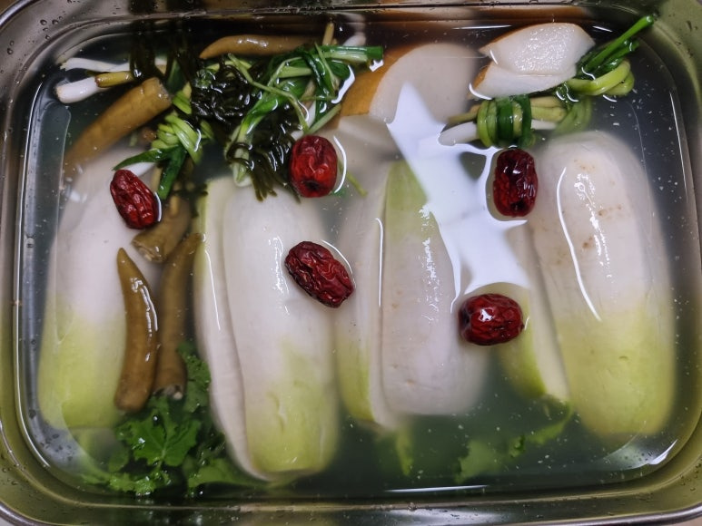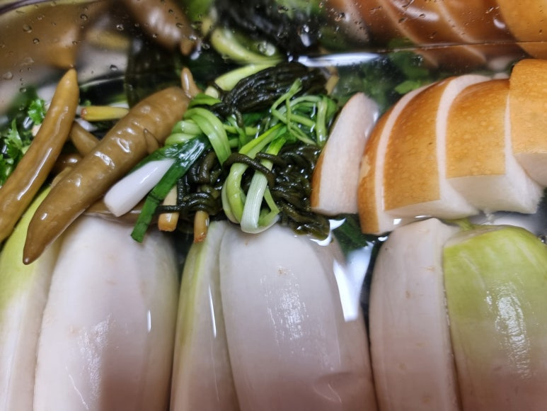 무2kg, 타래 지은 채소, 배1/4개, 삭힌 고추 50g, 대추 5알, 소금물 3리터