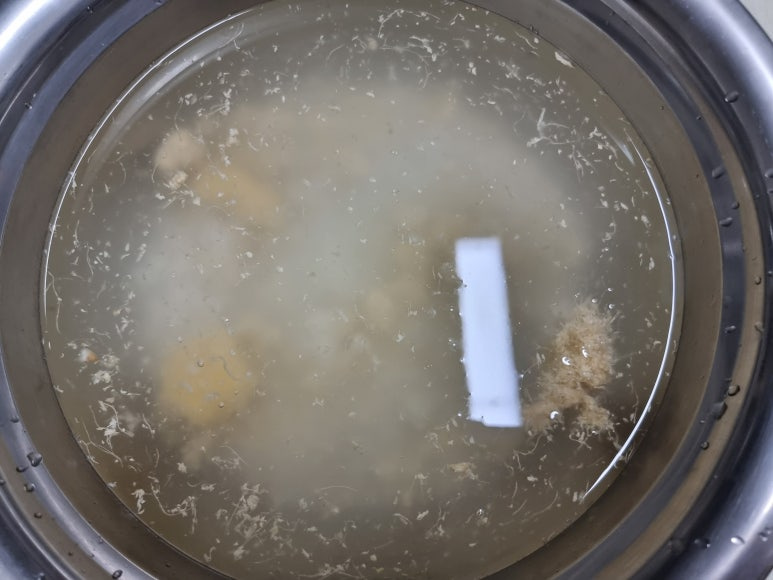 물 3리터에 소금 42g을 넣고 다진 마늘 50g, 다진 생강 10g, 찹쌀 풀 100g