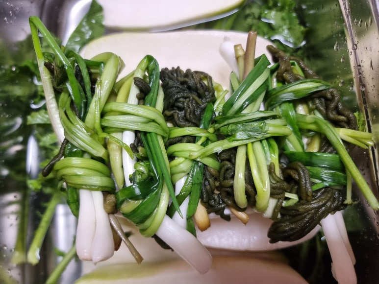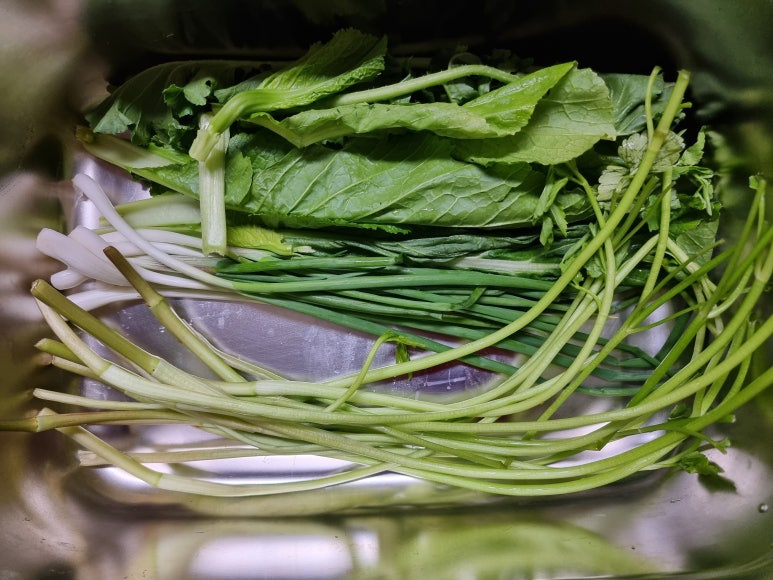 미나리 25g, 쪽파 25g, 갓 25g, 소금물