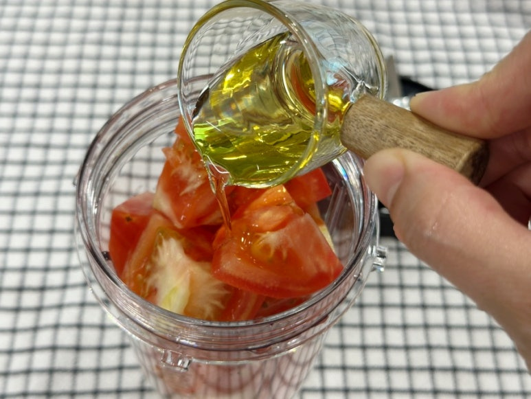 완숙토마토 2개 , 바나나 1개 , 올리브오일 1.5T , 레몬즙 1t
