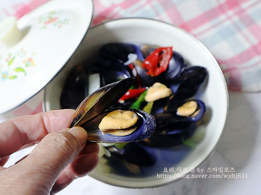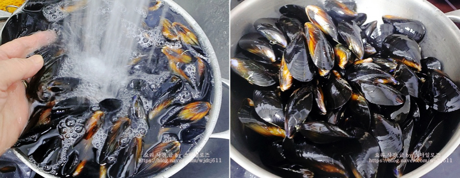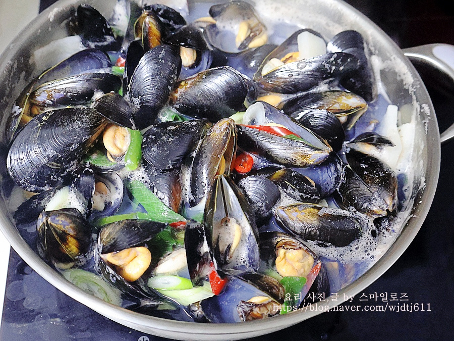 홍합을 오래 끓이면 질겨질 수 있기에 입이 벌어지면