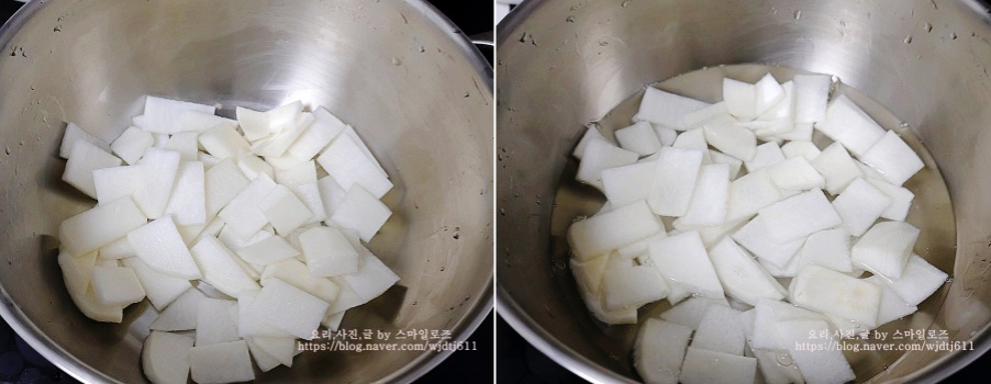 냄비에 나박 썬 무를 넣고 물을 붓고 끓여줍니다