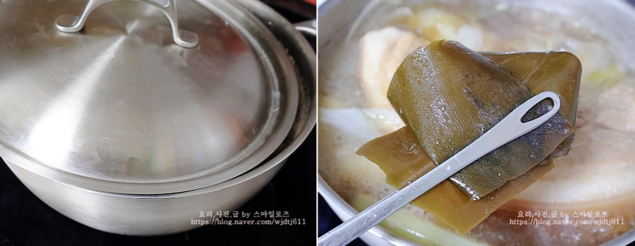 불세기는 중불로 줄인 다음 한소끔 더 끓인 뒤 다시마는 건져냅니다