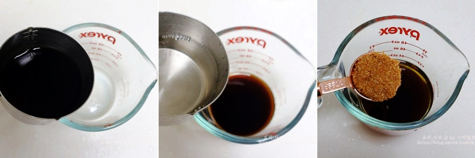계량컵에 진간장 80ml와 소주 50ml 흑설탕 2큰술을 넣어주는데