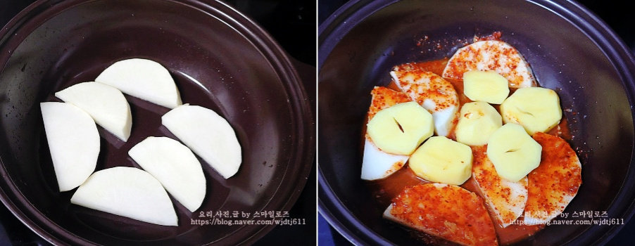 냄비나 뚝배기에 무를 깔아주고 감자도 갈아준 다음