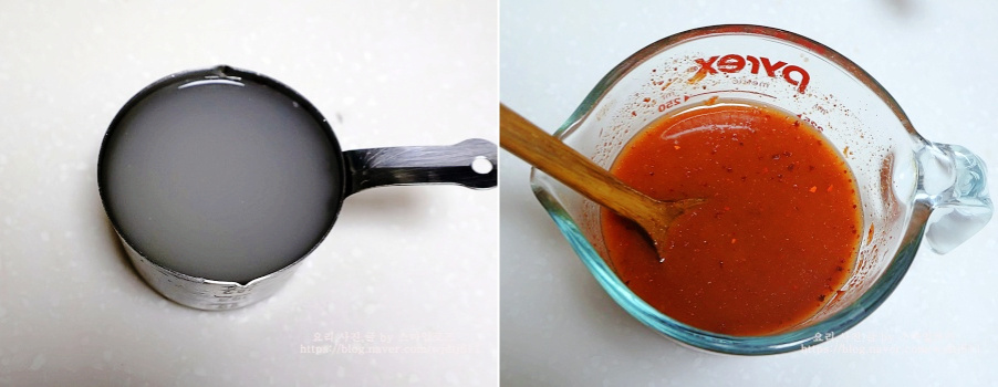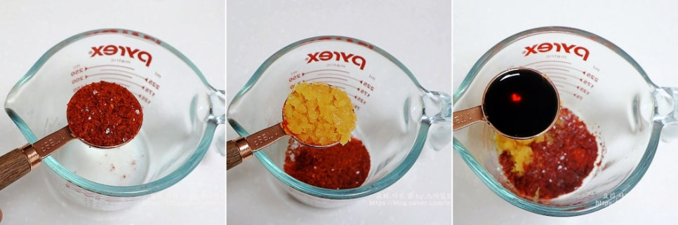 고춧가루 4큰술 진간장 2큰술 다진 마늘 1큰술 고추장 1큰술 된장 1작은술 참치 액 1큰술 맛술 2큰술 물엿 2큰술 후추 약간 쌀 듯 물 500ml , 계량스푼/계량컵 사용 1큰술=15ml 1작은술=5ml 1컵=200ml