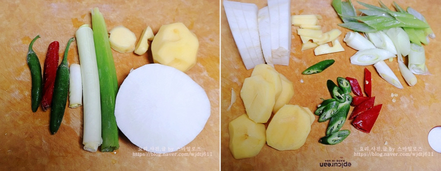 감자도 도톰하고 큼직하게 썰고 대파 청양고추 홍고추는 어슷 썰고
