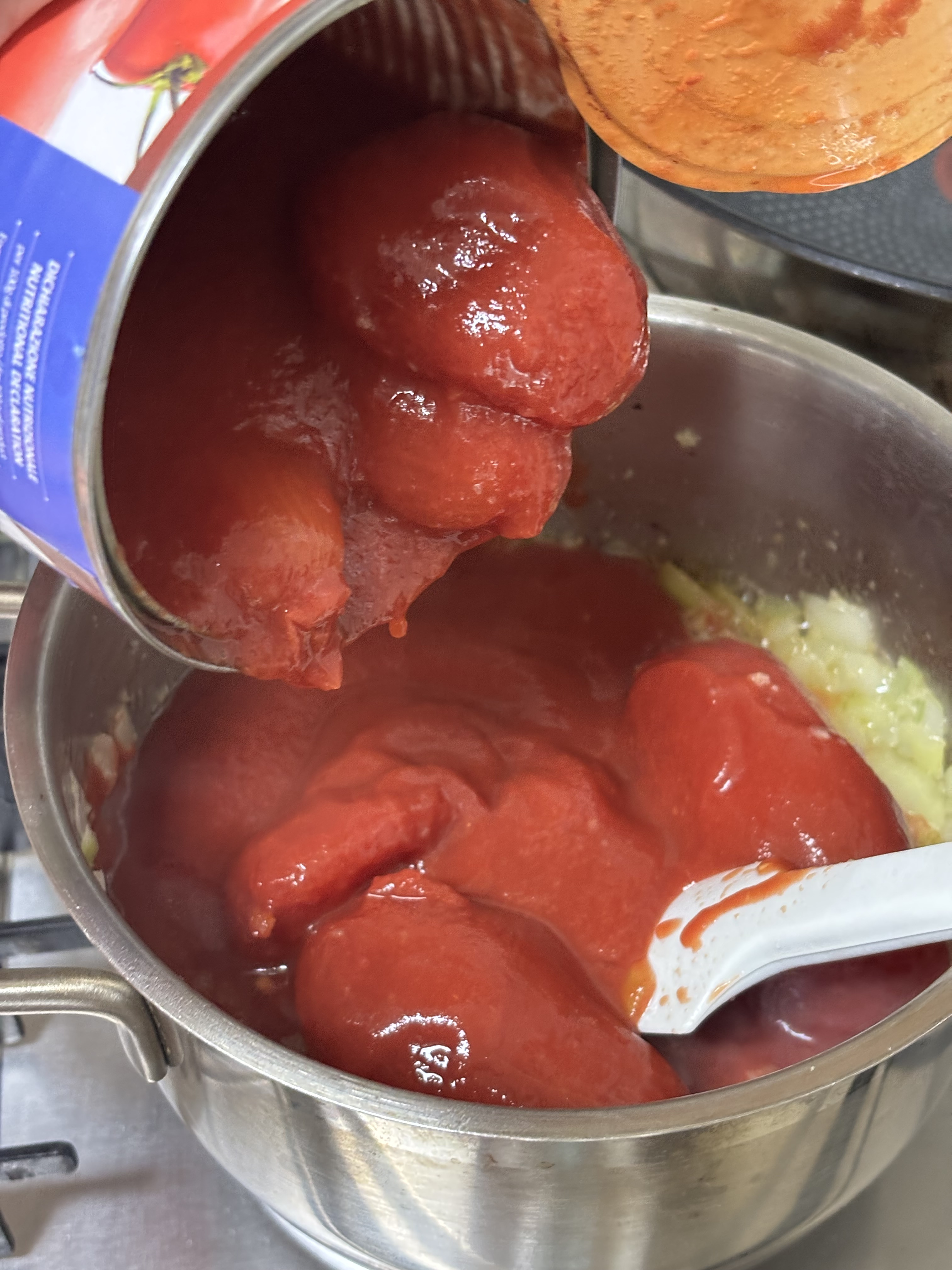 2. 양파와 다진 마늘이 어느 정도 익으면 홀 토마토 통조림 400g을 넣고 끓여주세요.