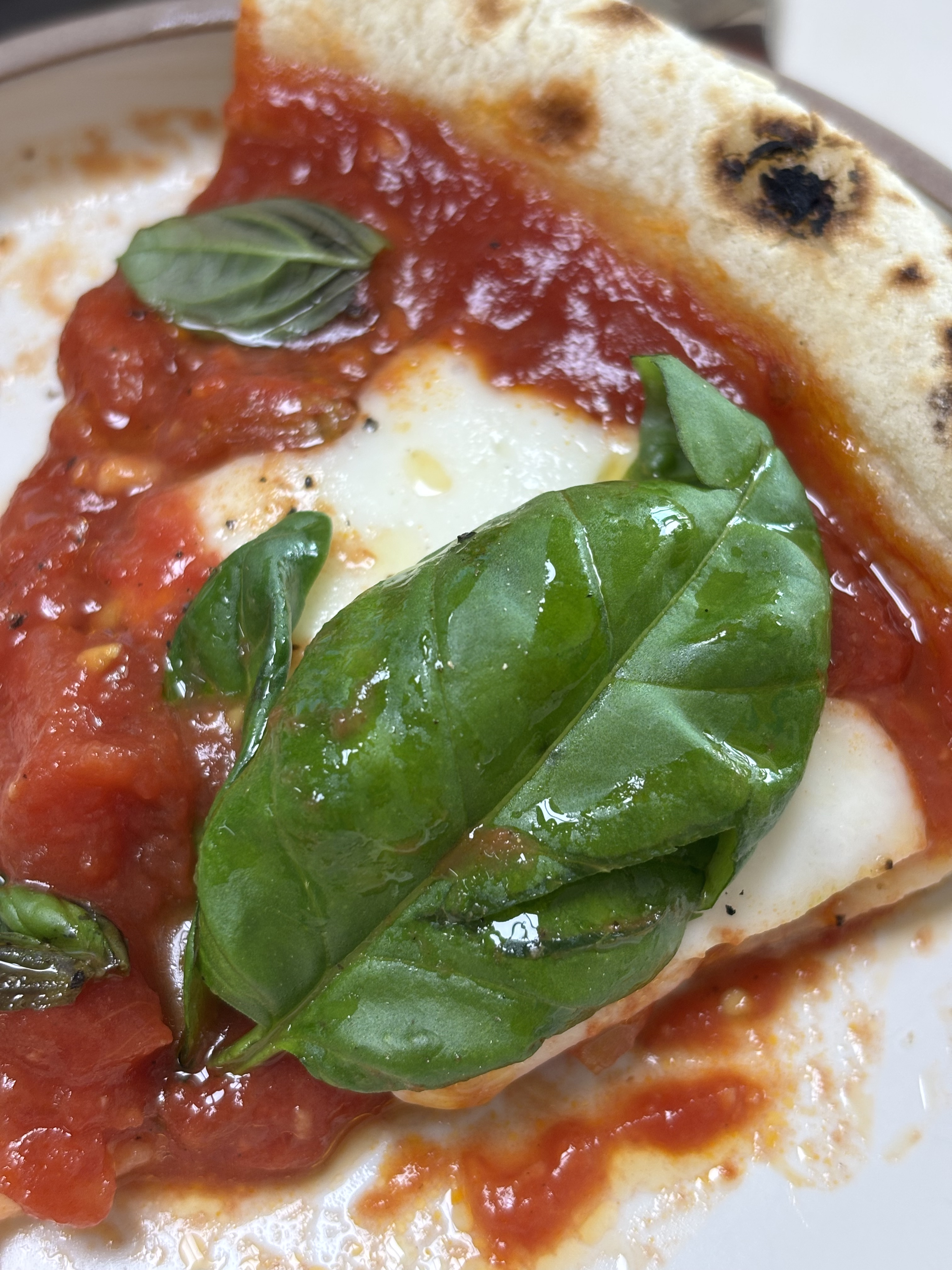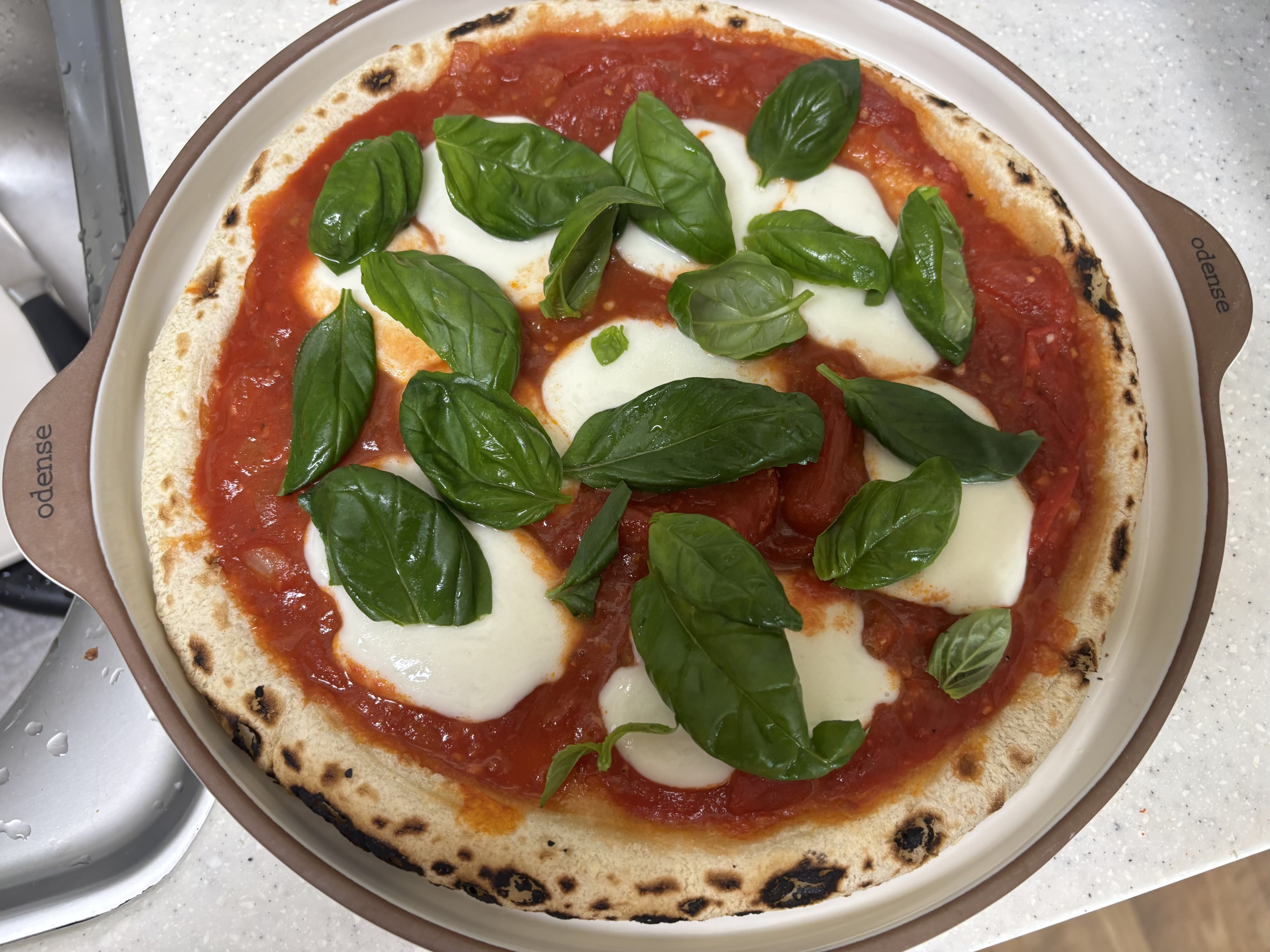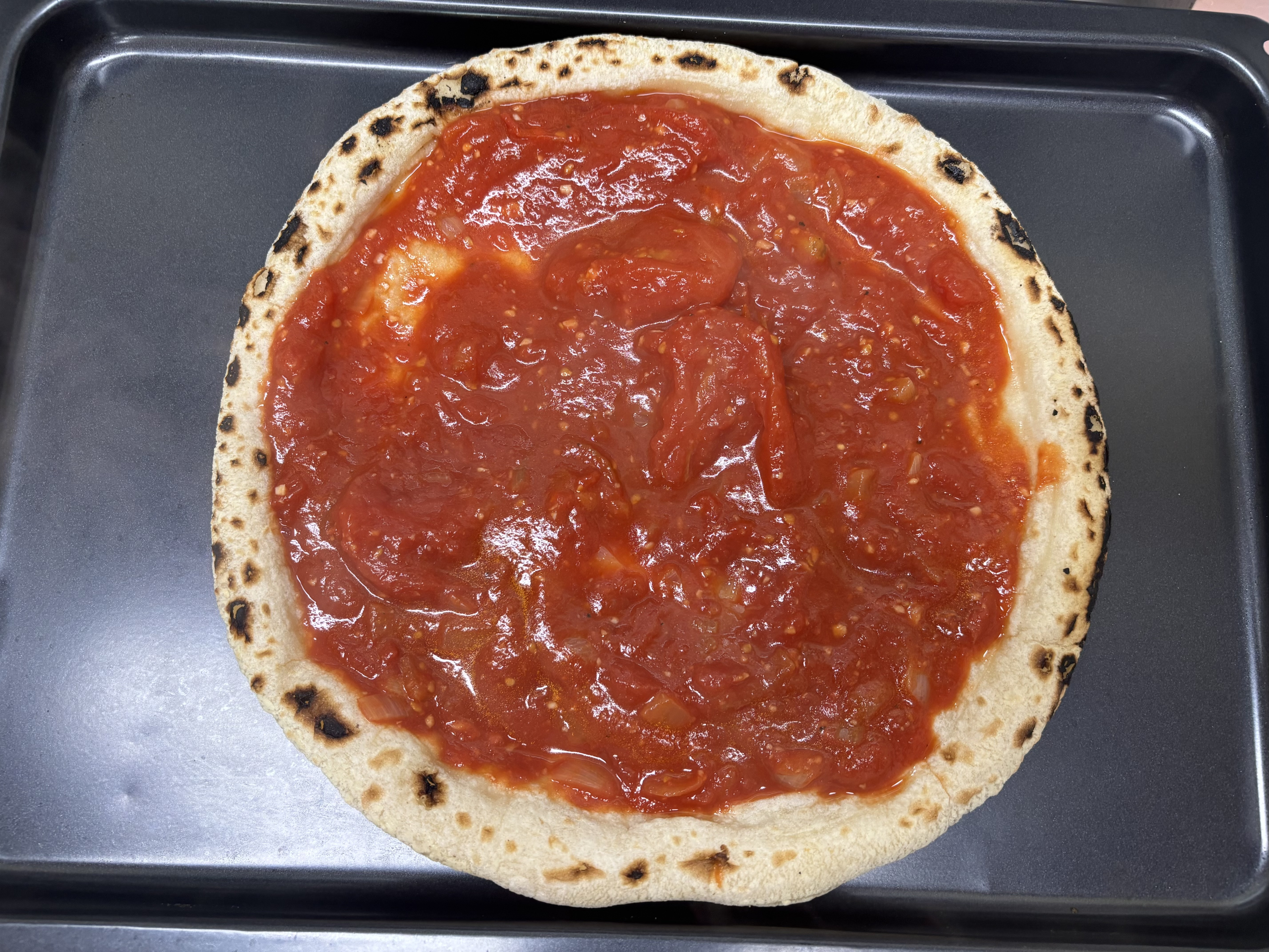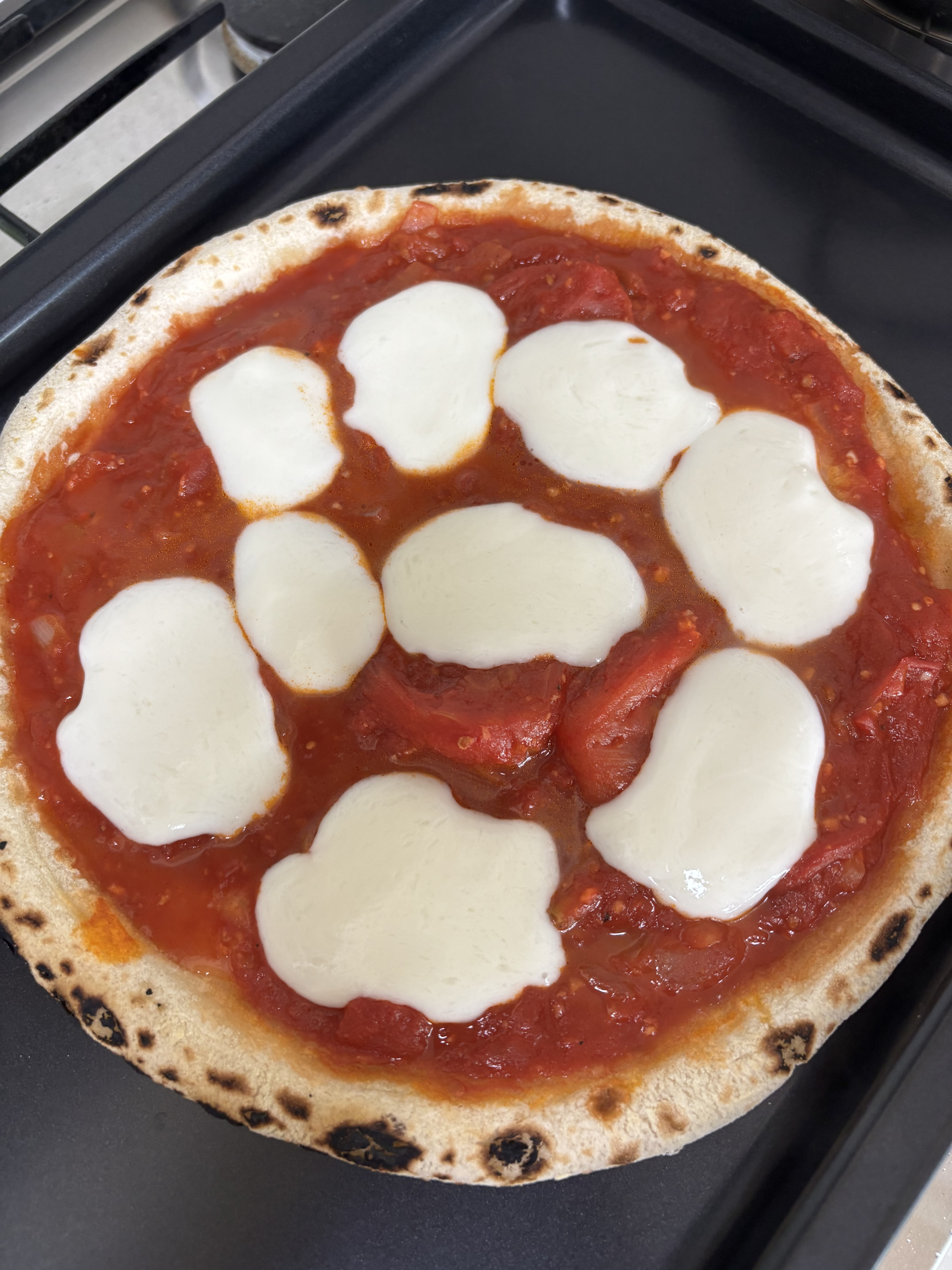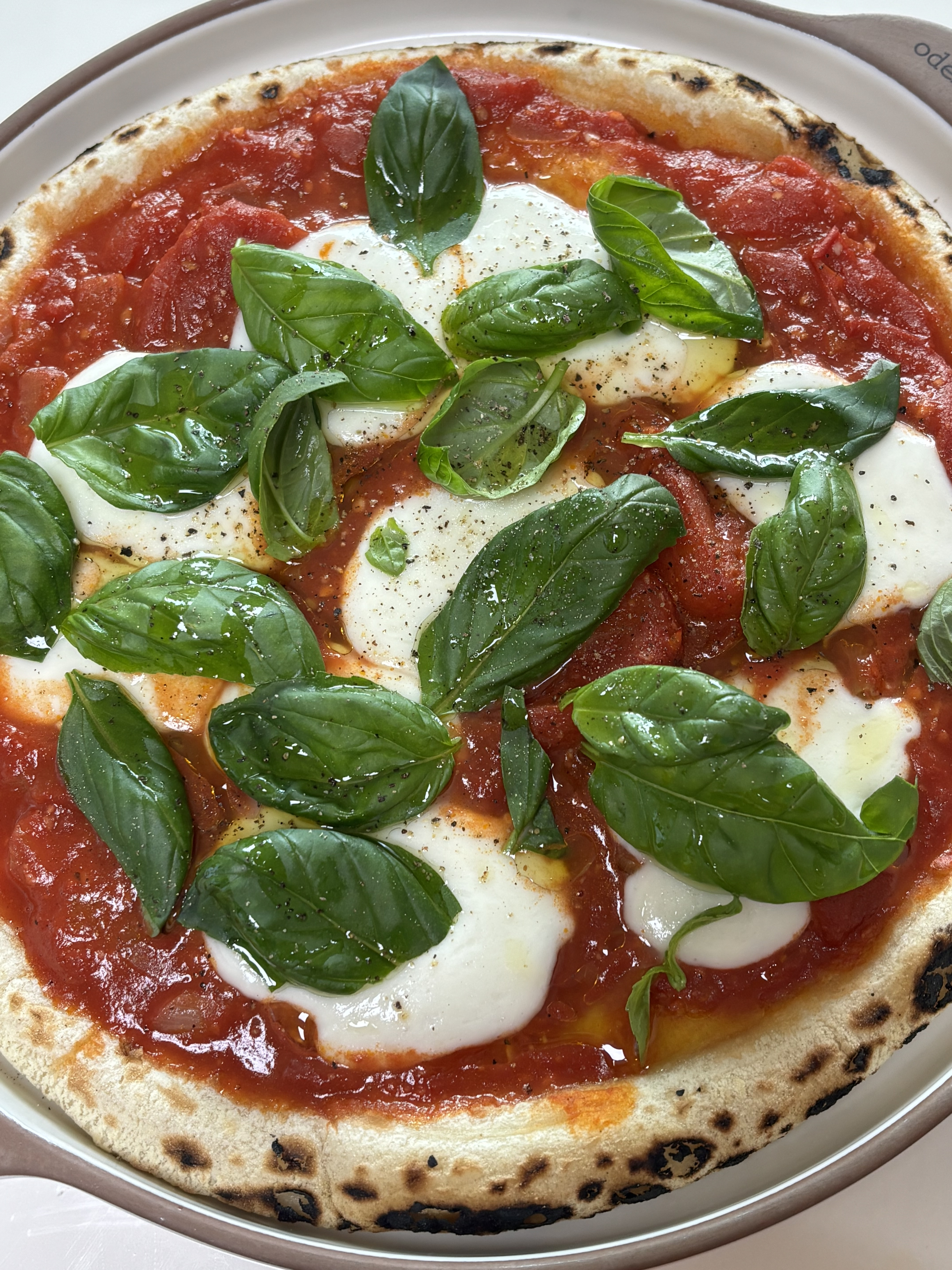 화덕피자도우 25 cm , 홀토마토 또는 피자 소스 ok , 모짜렐라 치즈 100 g , 생 바질 , 올리브유 후추