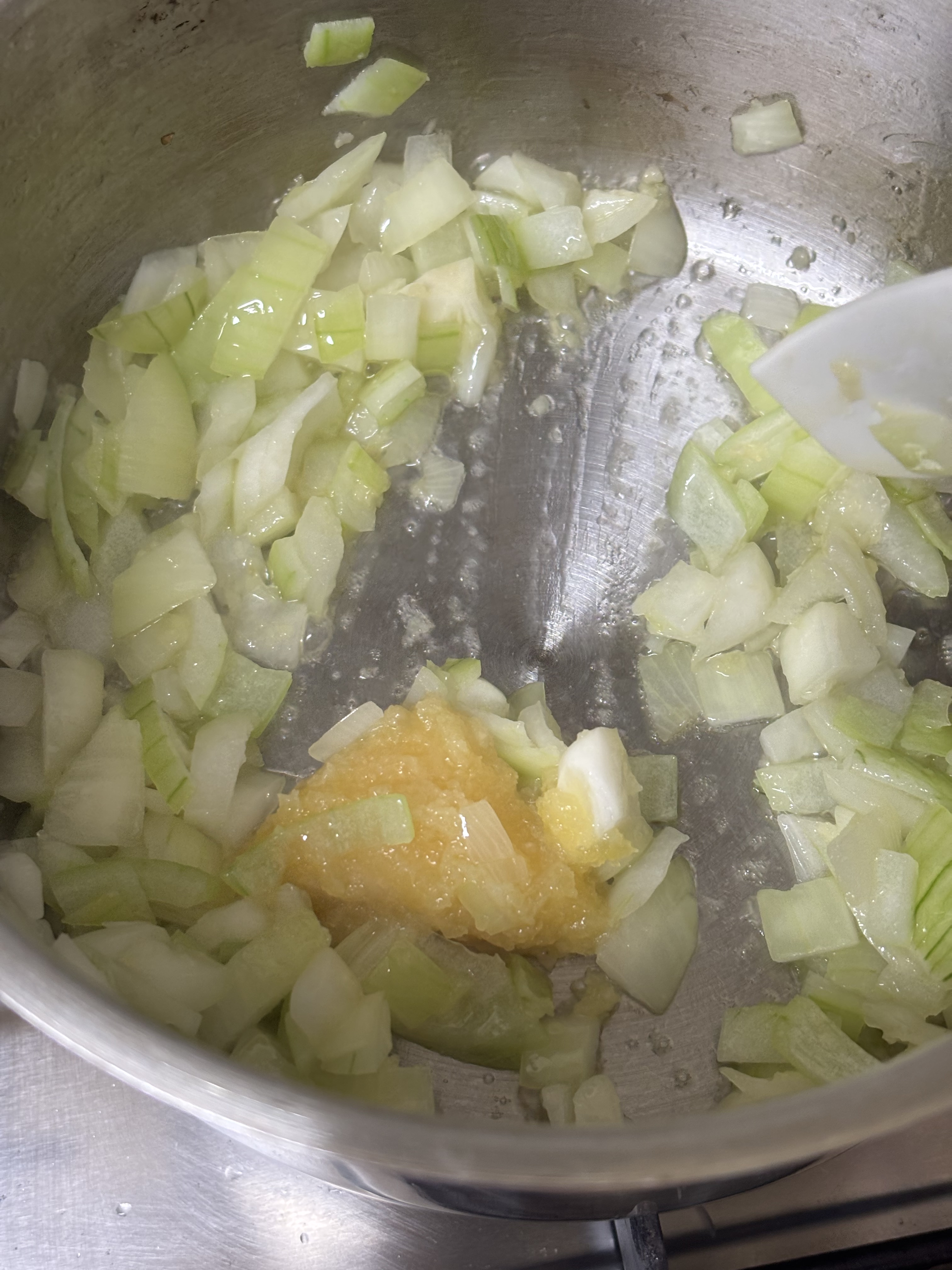 1. 올리브유를 두른 후 잘게 썬 양파 반 개와 다진 마늘 한 스푼을 넣어 볶아줍니다.