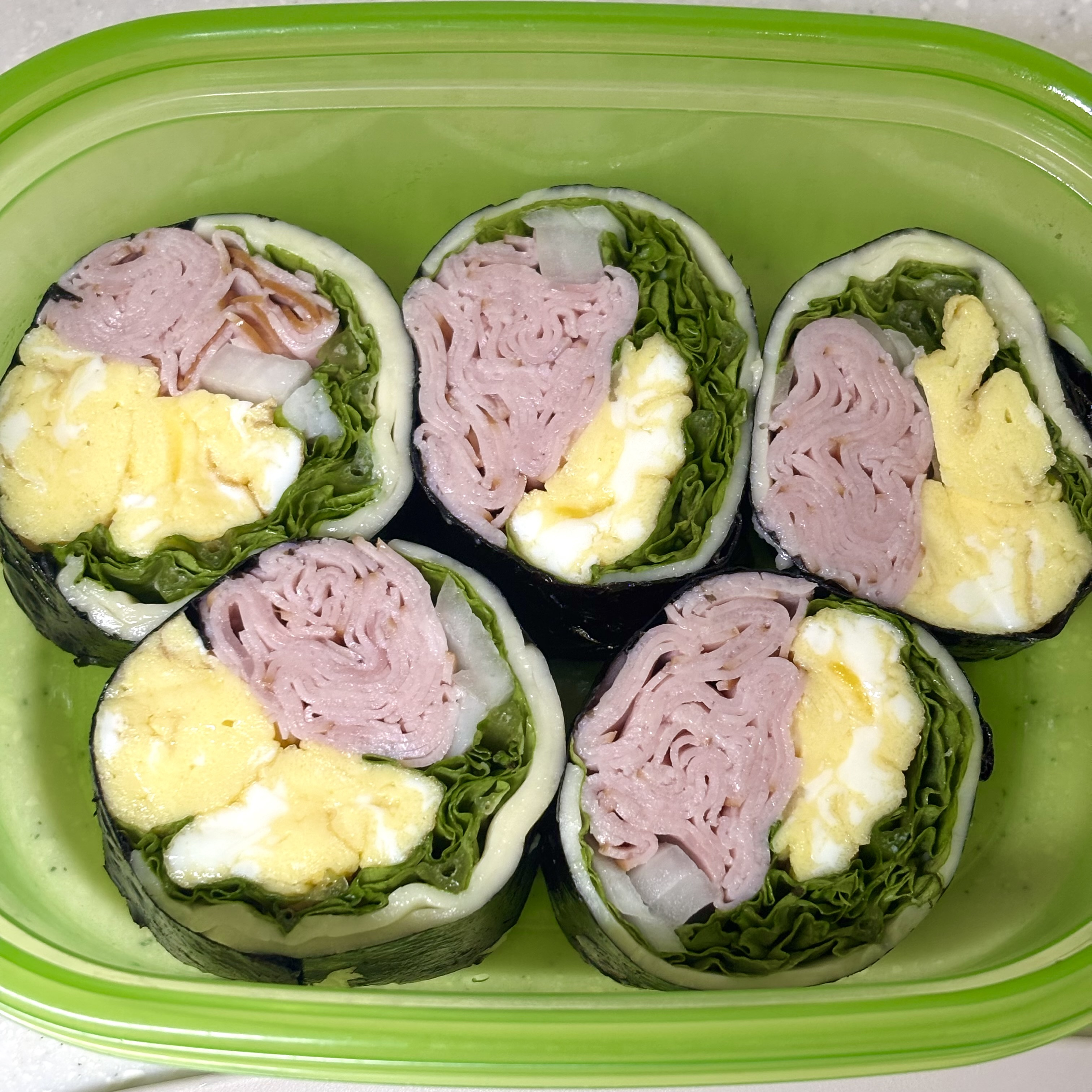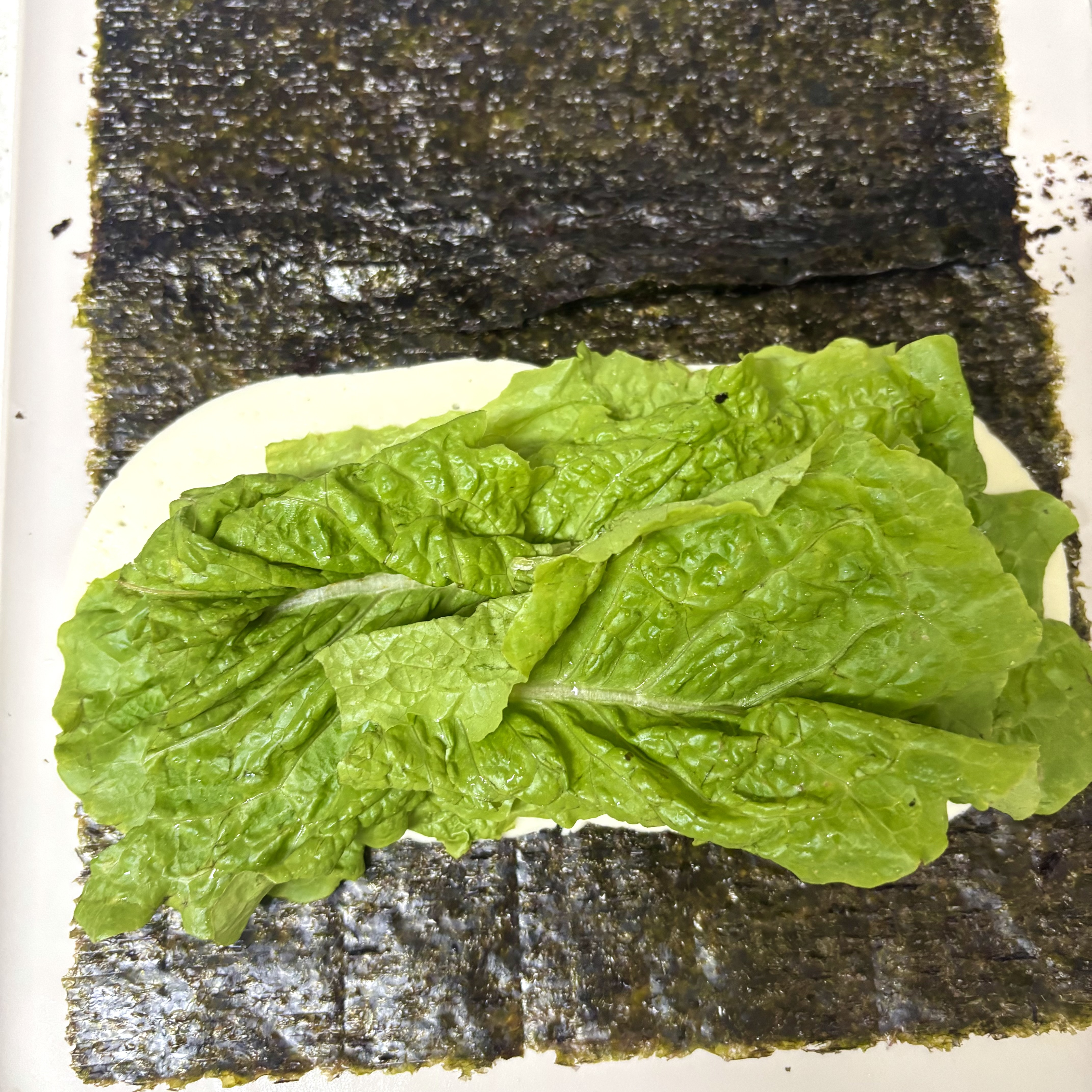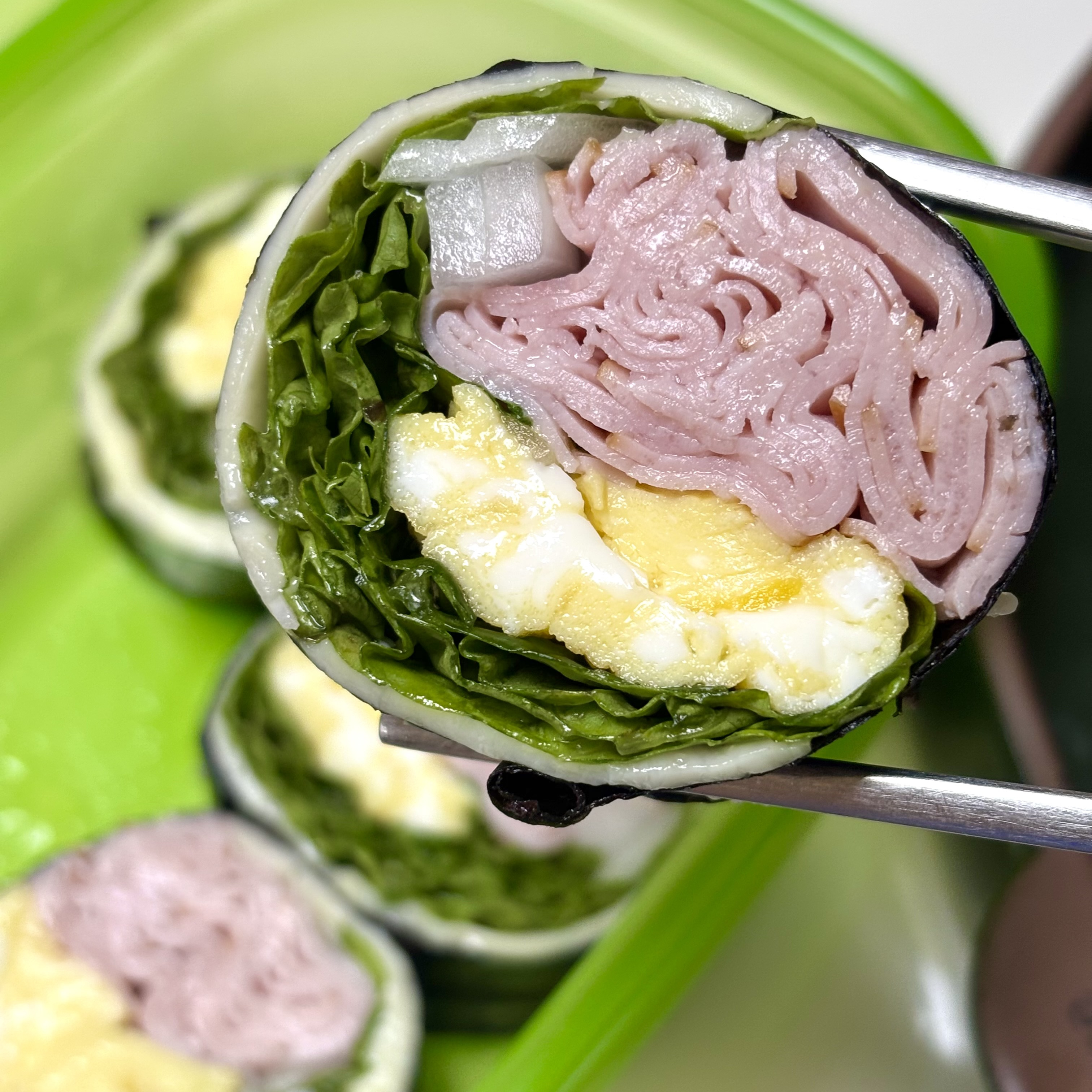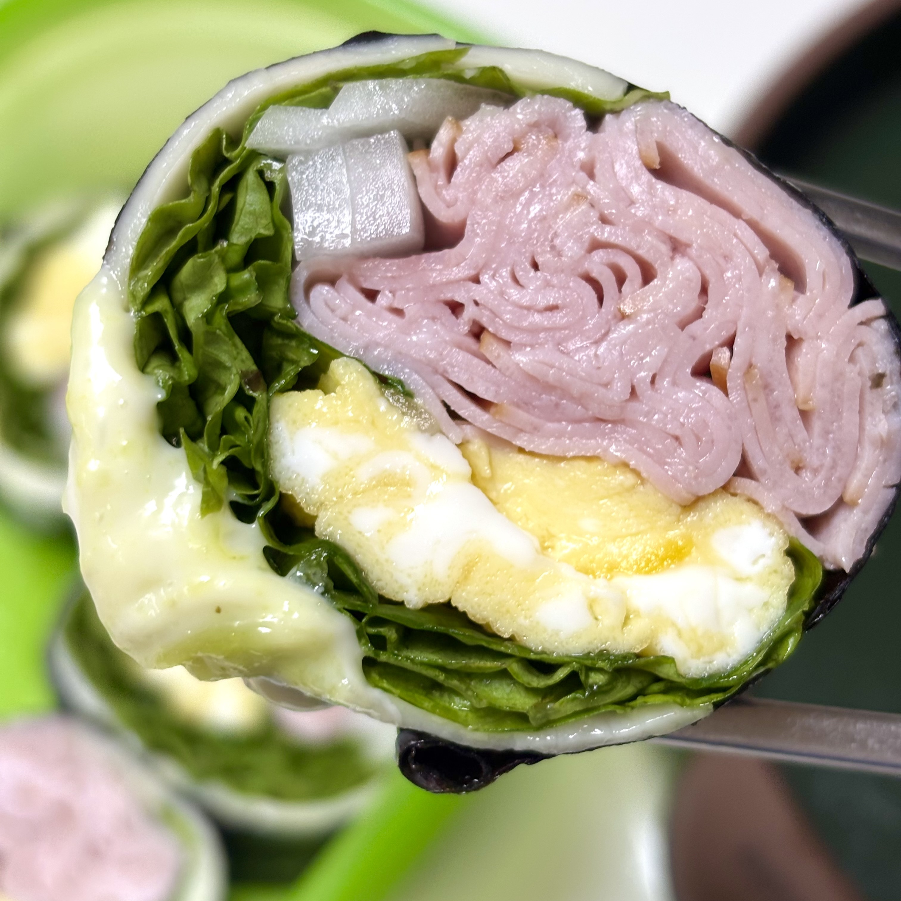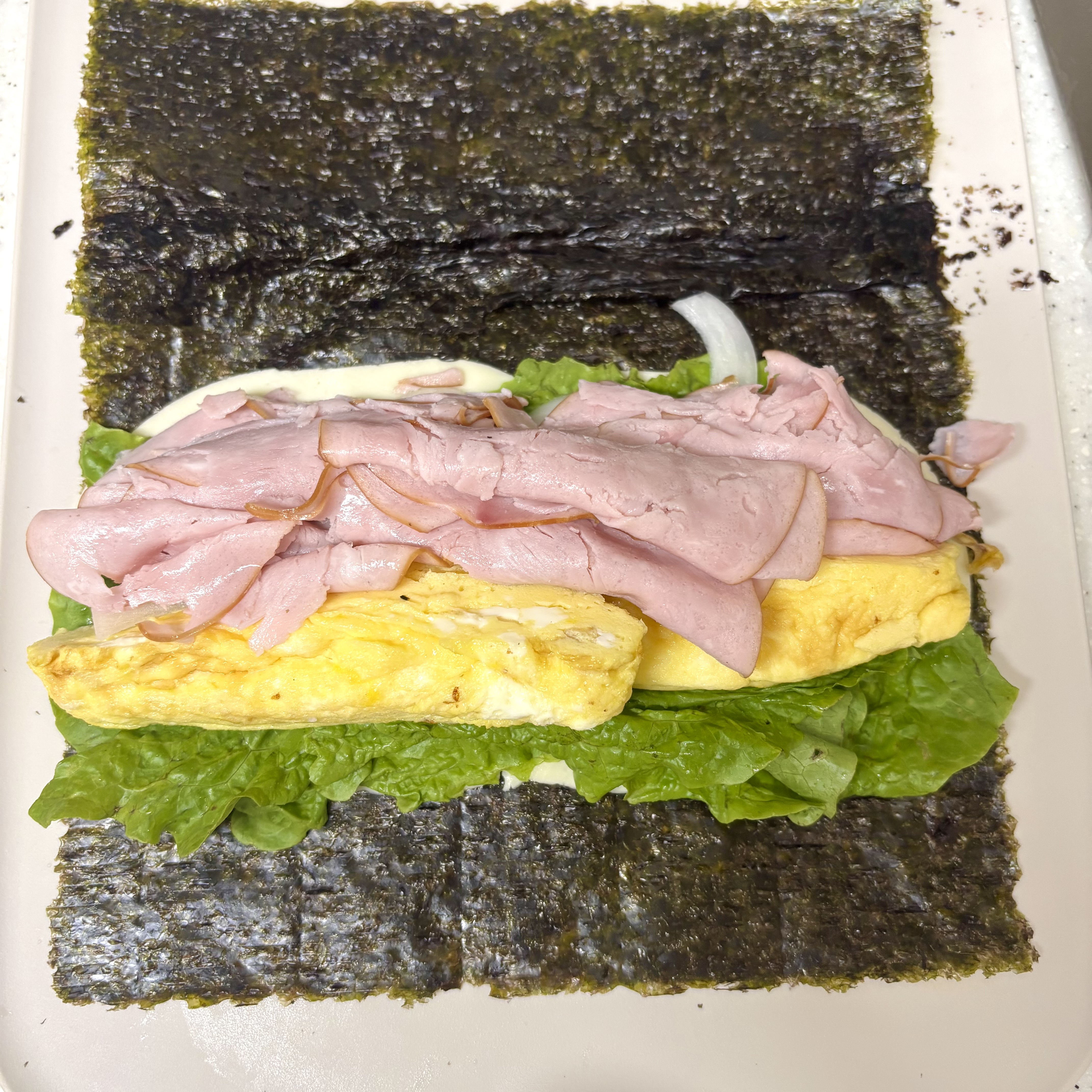 이제 상추와 달걀, 슬라이스 햄을 올린 후 김밥을 말아주세요.