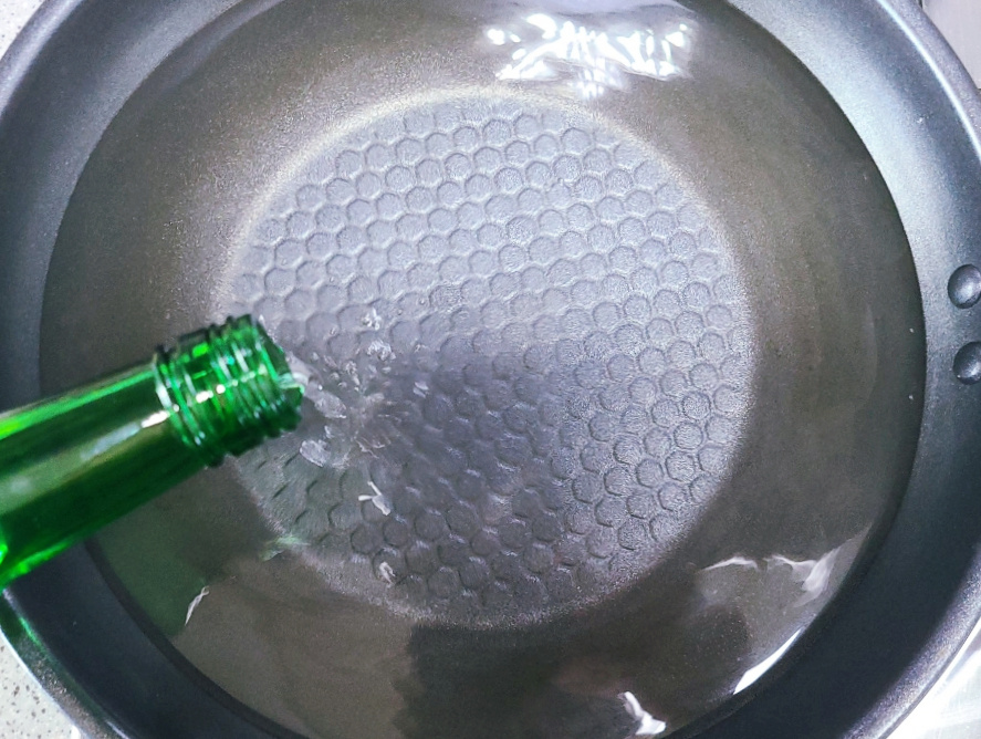 냄비에 물 1.2리터와 소주 30ml를 넣고 가스불 센불에 올려줍니다.