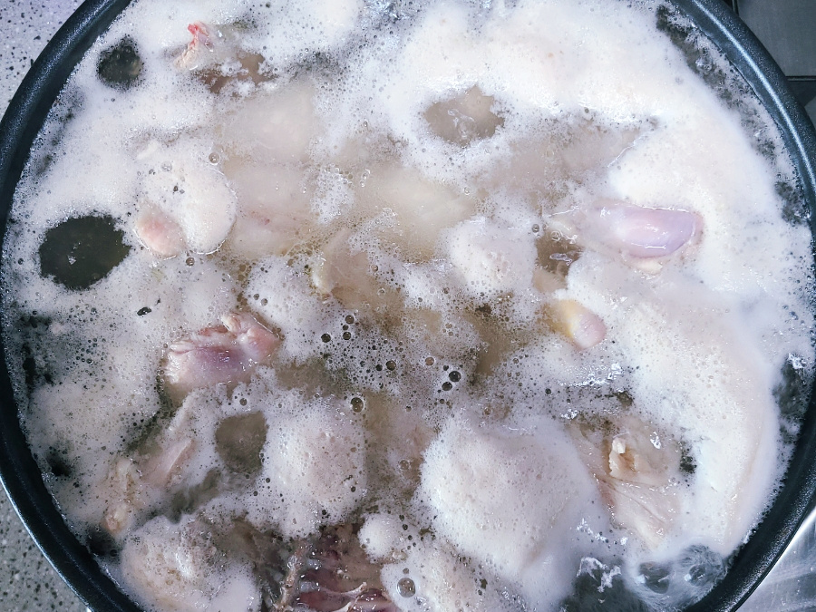 물이 끓어오르면 세척한 닭과 닭다라를 넣고 뒤적여 준 다음에