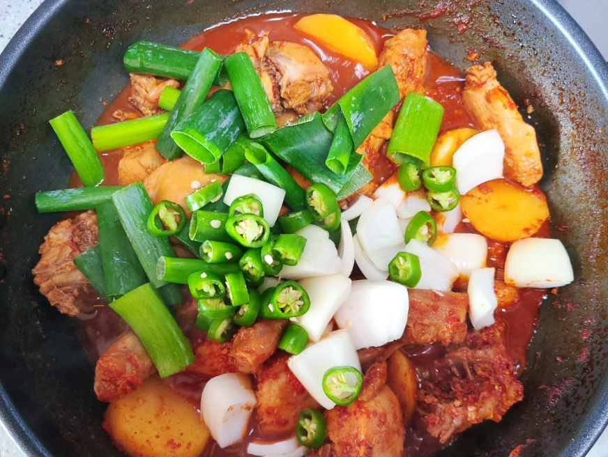 볶음탕용 닭 600 g , 닭다리 400 g , 감자 2개 150 g , 대파 50 g , 양파 80 g , 청양고추 2개 20 g , 다진마늘 1 큰술 (밥 숟가락계량), 진간장 80 ml , 설탕 2 큰술 (밥 숟가락계량), 고춧가루 3 큰술 (밥 숟가락계량), 후춧가루 톡톡톡 , 물 600 ml , 통깨 솔솔솔