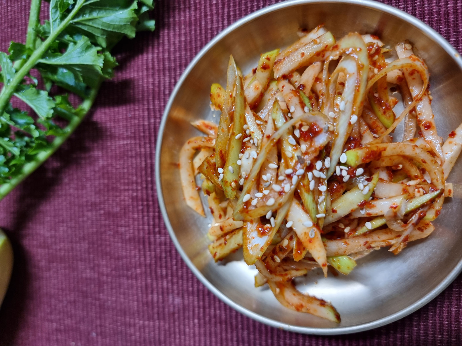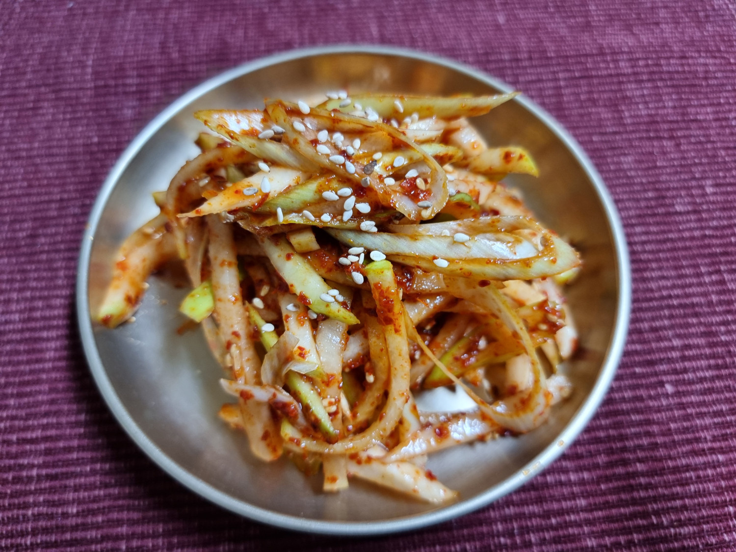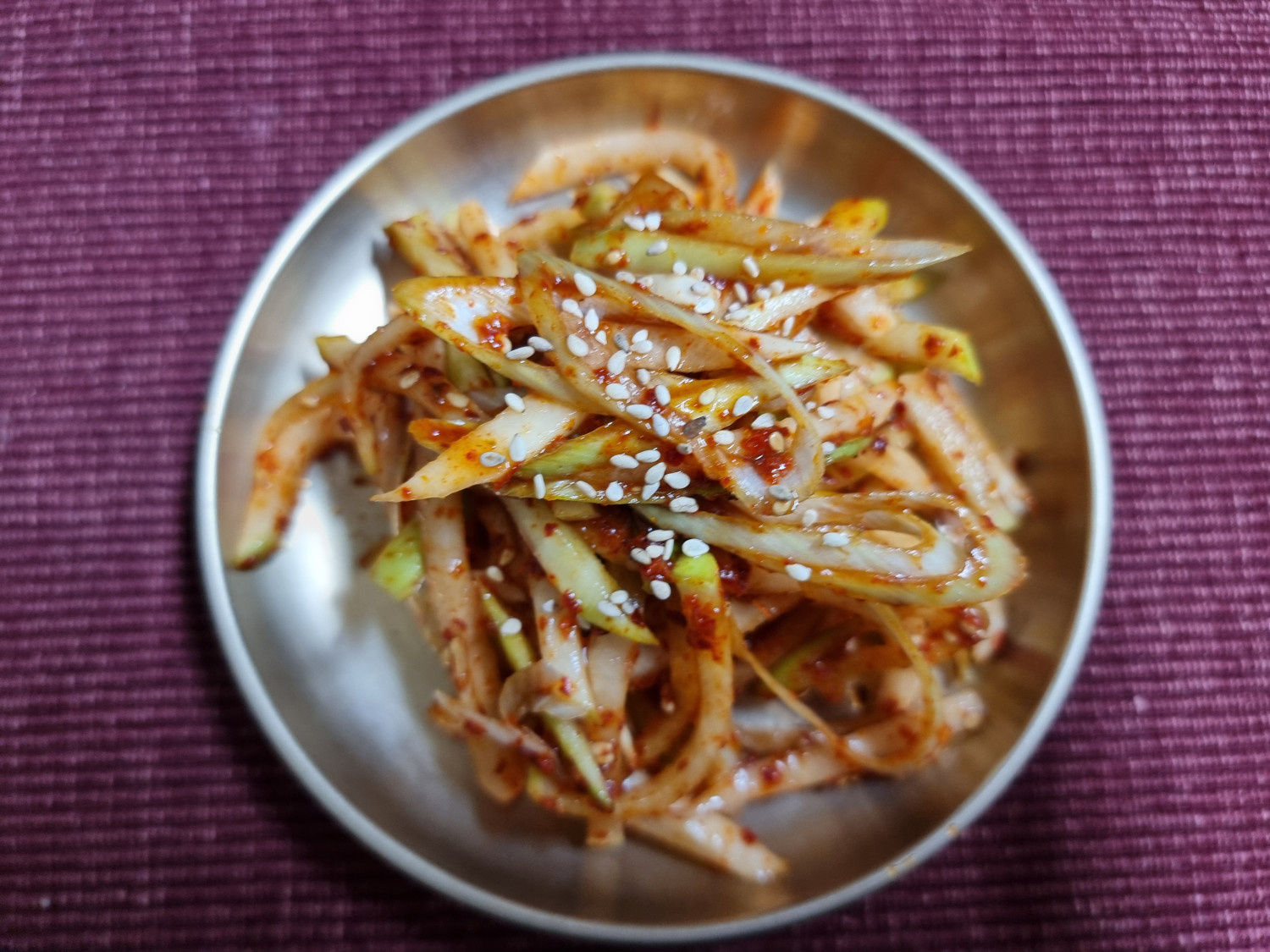 요즘 텃밭 무가 잘 자라서, 뽑자마자 싱싱함이 살아 있는 무로 무생채를 만들어 봤어요.