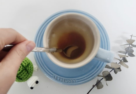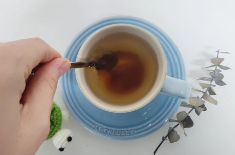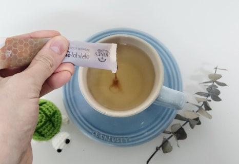 이제 컵에 따뜻한 대추생강차를 부어주세요. 그리고 달달한 맛을 내기 위해서 꿀스틱 하나를 넣어 줍니다. 일반꿀을 넣는다면 1T 정도 넣어주면 됩니다.