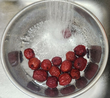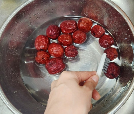 몸속까지 따끈하게 만들어 주는 대추생강차를 만들기 위해서 마른대추를 준비해 주세요. 저는 큰 사이즈의 사과대추 14개를 준비했는데요. 작은사이즈 대추라면 더 많이 준비해 주세요. 마른대추를 깨끗하게 씻어주는데요. 대추 사이사이에 먼지가 끼어 있을 수 있으니, 저는 솔을 이용해서 하나하나 닦아 주었어요.