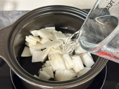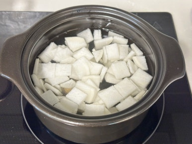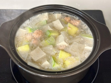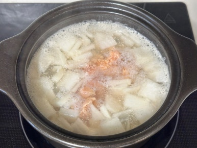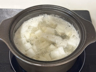 명란젓갈 4개 , 호박 1/2개 , 두부 1/2개 , 무 300g , 대파 1/2개 , 홍고추 1개 , 코인 육수 1개 , 물 700ml