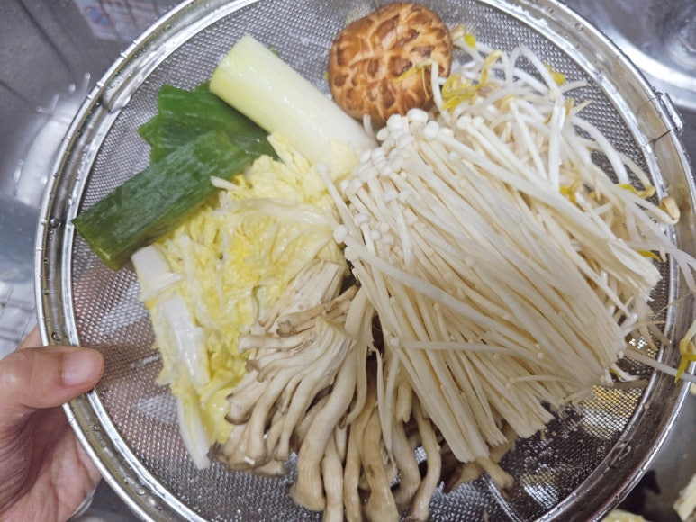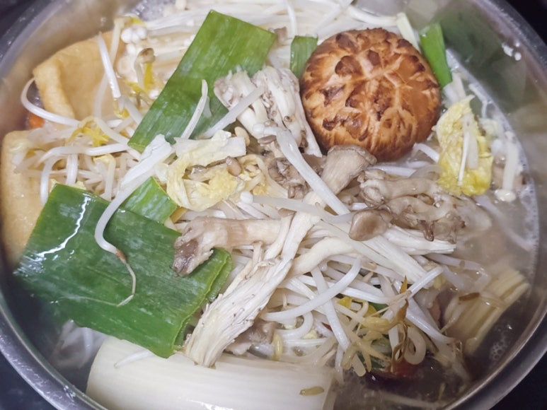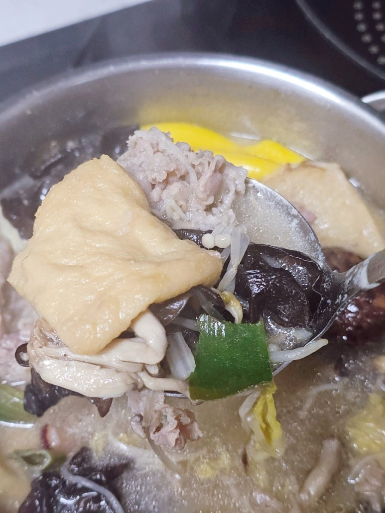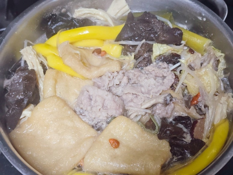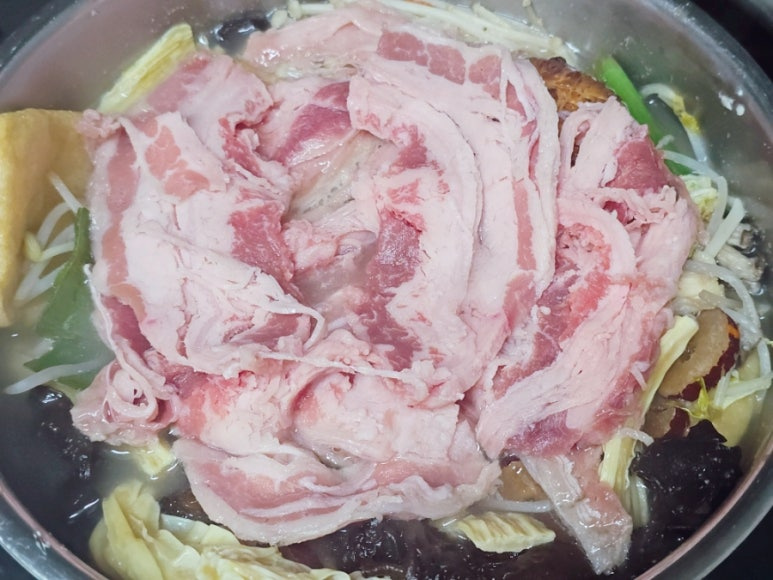 우삼겹 200 g , 백탕 하이디라오 소스 1 봉 , 목이버섯 1/2 컵 , 팽이버섯 1 봉지 , 표고버섯 1-2 개 , 느타리버섯 1 줌 , 숙주 1 줌 , 대파 1 뿌리 , 알배기 배추 3 장 , 유부피 4 장 , 당면 1 줌 , 푸주 약간 , 옥수수면 6 줄