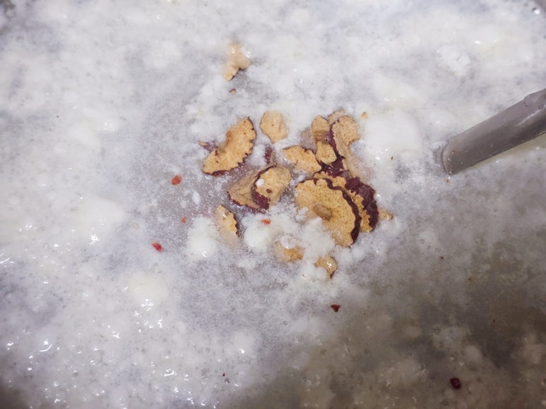 훠궈소스를 넣어 물에 잘 풀어지도록 저으며 끓입니다.