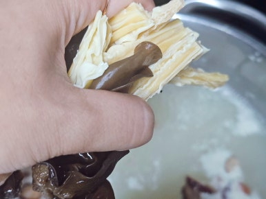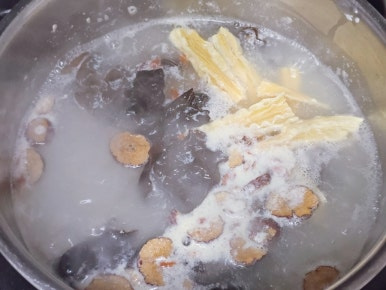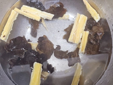 국물이 끓는 동안 목이버섯과 푸주는 물에 불려요.