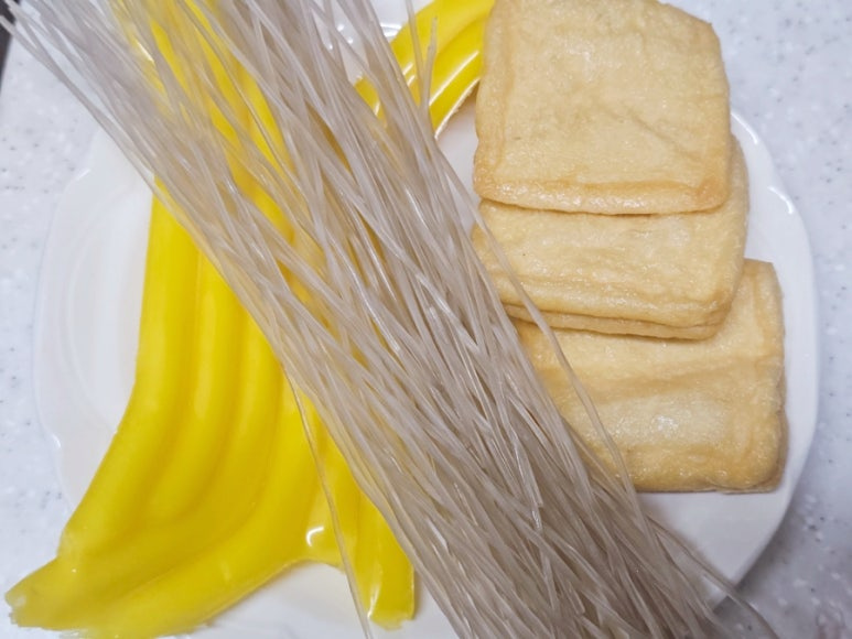 옥수수면, 유부피, 당면을 준비해 놓습니다.