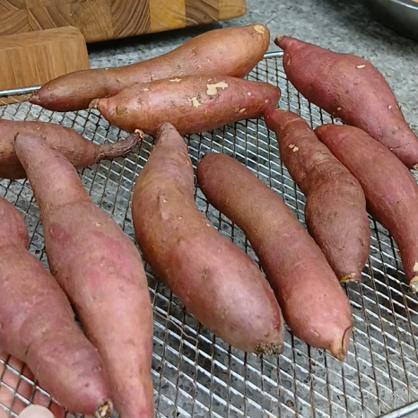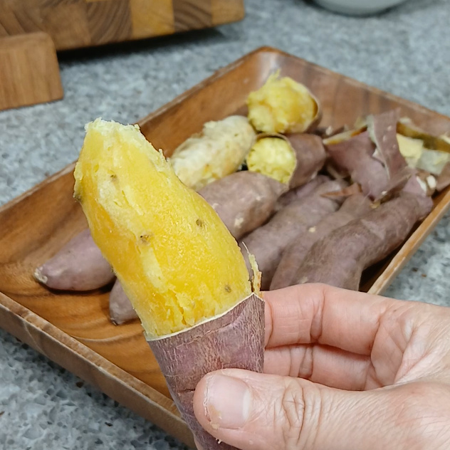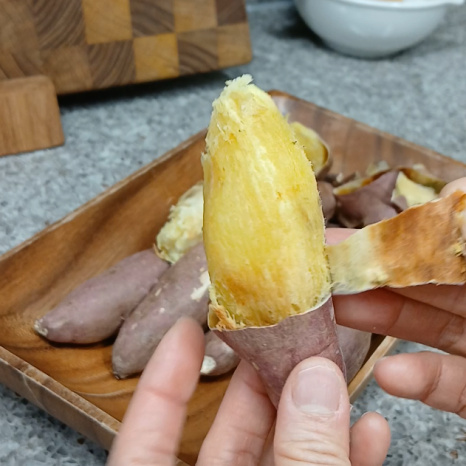 갓 구워진 고구마는 매우 뜨거우니 충분히 식혀서 껍질을 깝니다