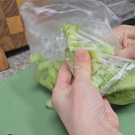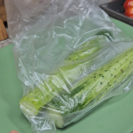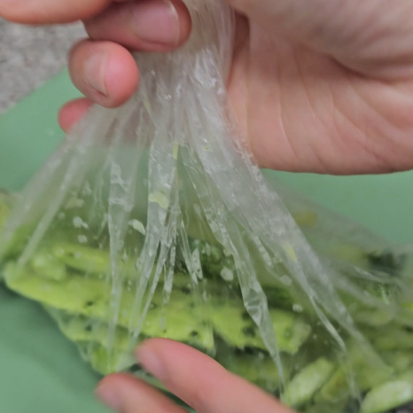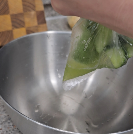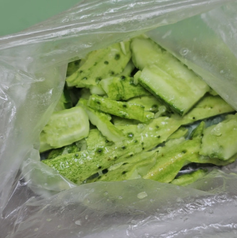 오이는 면보를 활용해서 수분을 제거하셔도 좋고 귀찮다면 이렇게 위생팩 한 모서리를 가위로 자른 후 물을 빼주는 방법도 있어요