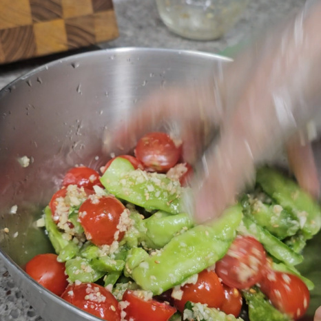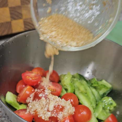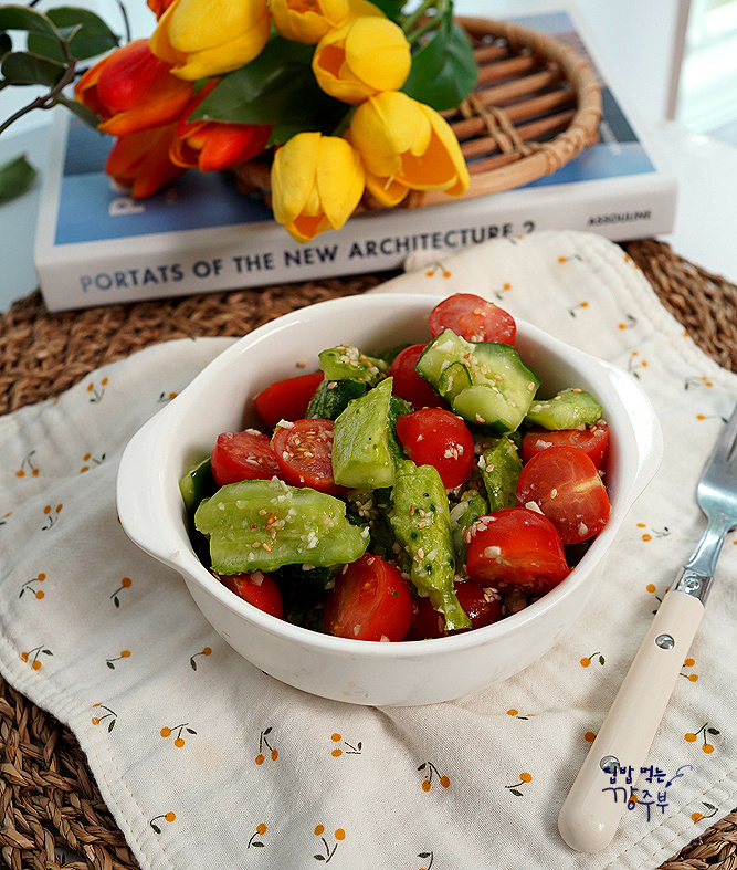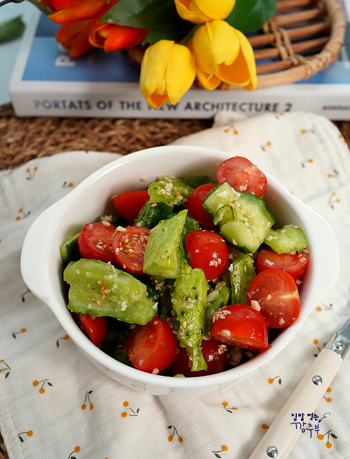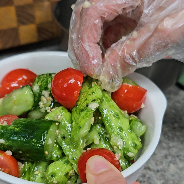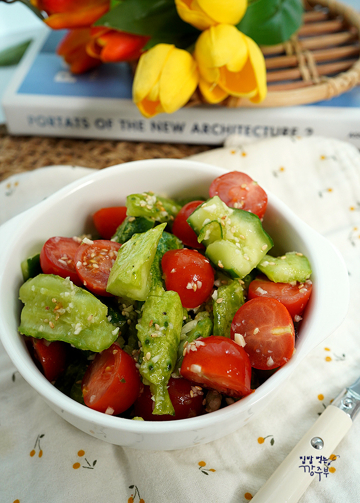 넉넉한 볼에 물기를 뺀 오이와 토마토, 소스를 모두 담아준 후 골고루 버무려주기만 하면 완성!