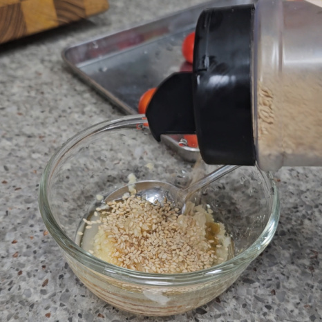 식초 3숟가락, 설탕 2숟가락, 참치액 1숟가락, 다진마늘 1.5숟가락, 참기름 1숟가락, 통깨 약간