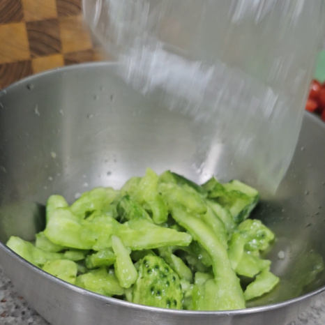10~15분 뒤 절인 오이를 확인해 보면 이렇게 수분이 많이 나왔을 거예요