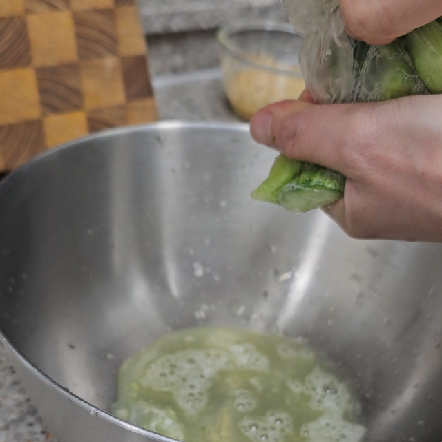 비닐이 터지지 않도록 조심해서 손에 무게감을 실어 탕탕 두드려주며 오이를 으깨어주세요