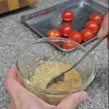 방울토마토는 꼭지를 제거하고 식초를 1~2스푼 푼 물에 잠시 담가두었다가 손으로 하나하나 문질러가며 씻어주세요