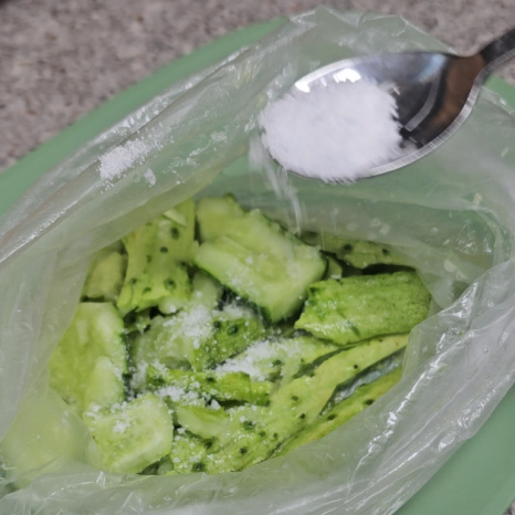 이어서 소금을 반 스푼 넣어준 후 위생팩을 두 손으로 골고루 비벼서 오이에 소금이 잘 베어들도 록 합니다