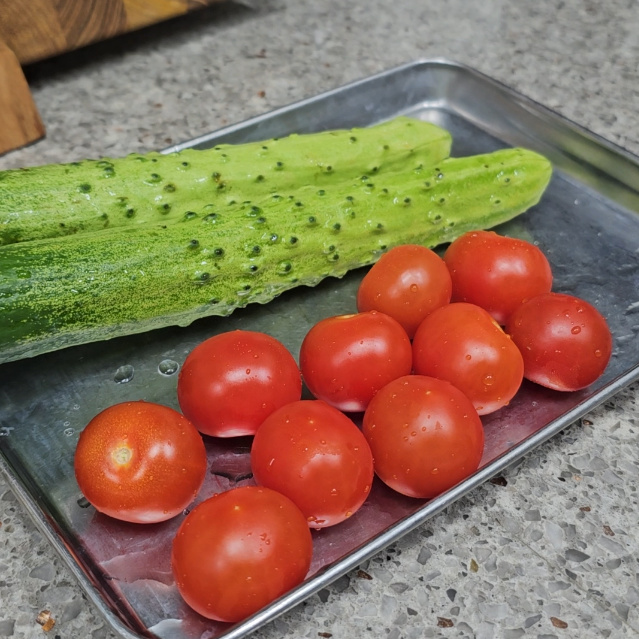 사실 토마토도 손으로 쫙쫙 찢어주면 훨씬 더 맛있는데 토마토 과육이 사방팔방 튈 수 있으니 그냥 칼로 반으로 잘라줬네요