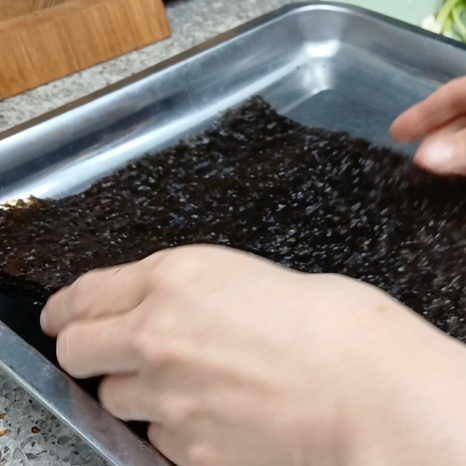구운 김은 한 김 식힌 후 손으로 대충 쭉쭉 뜯어서 위생팩에 넣어주세요