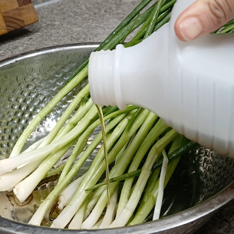손질된 쪽파를 가지런히 펼쳐 놓고 뿌리 부분에 멸치액젓 또는 까나리액젓을 2스푼 골고루 부어주세요