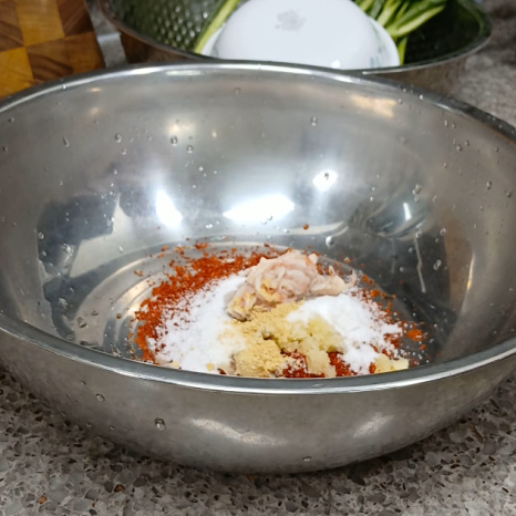 고춧가루 5숟가락, 설탕 2숟가락, 물엿 1.5숟가락, 새우젓 0.7숟가락, 다진마늘 1숟가락, 생강가루 약간