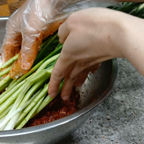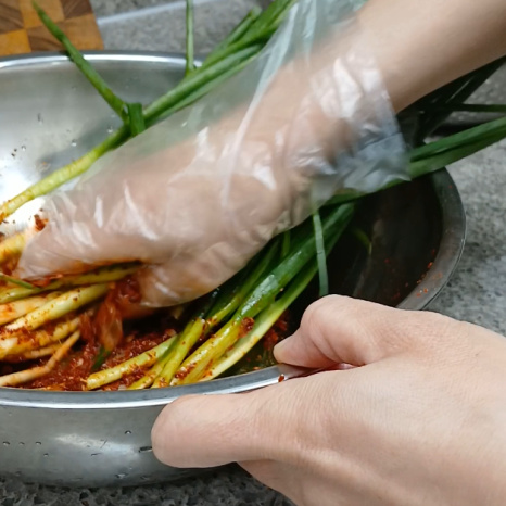 한 손으로 쪽파를 잡고 절일 때 사용한 액젓도 모두 양념장에 넣어주세요