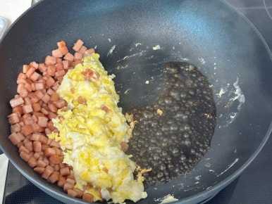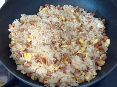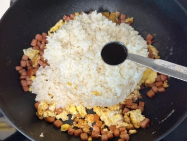 밥 3공기 , 스팸 100g , 계란 3개 , 진간장 1T , 굴소스 1t , 참기름 1t , 통깨 1t