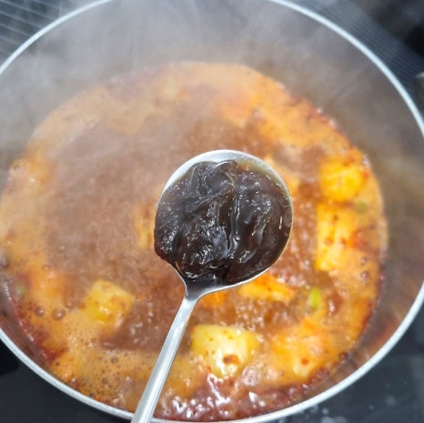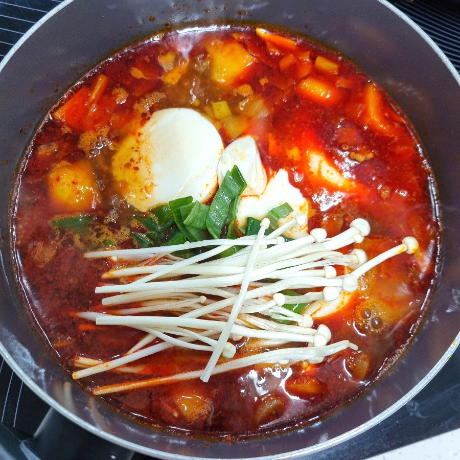 순두부, 쫄면, 버섯, 대파, 고추 넣고