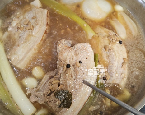 구운 통삼겹,된장, 통마늘, 대파, 양파, 생강, 월계수잎, 통후추, 청주/소주